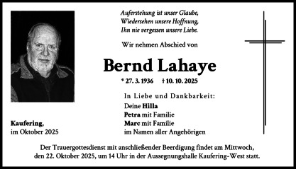 Neben der Fliegerei schlug sein Herz für den Chorgesang. So wurde Bernd Lahaye 2011 mit dem Ehrenzeichen des Ministerpräsidenten von Bayern ausgezeichnet. Er stand ehrenamtlich als Kreischorleiter dem Sängerkreis Landsberg am Lech vor und war Organist und Chorleiter verschiedener Chöre. Wir verlieren mit Bennd Lahaye einen ausgezeichneten Navigator und passionierten Chormusiker.